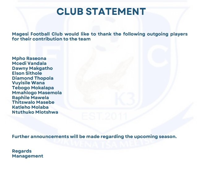 Newly-promoted Magesi FC have announced 12 exits ahead of their maiden DStv Premiership campaign.