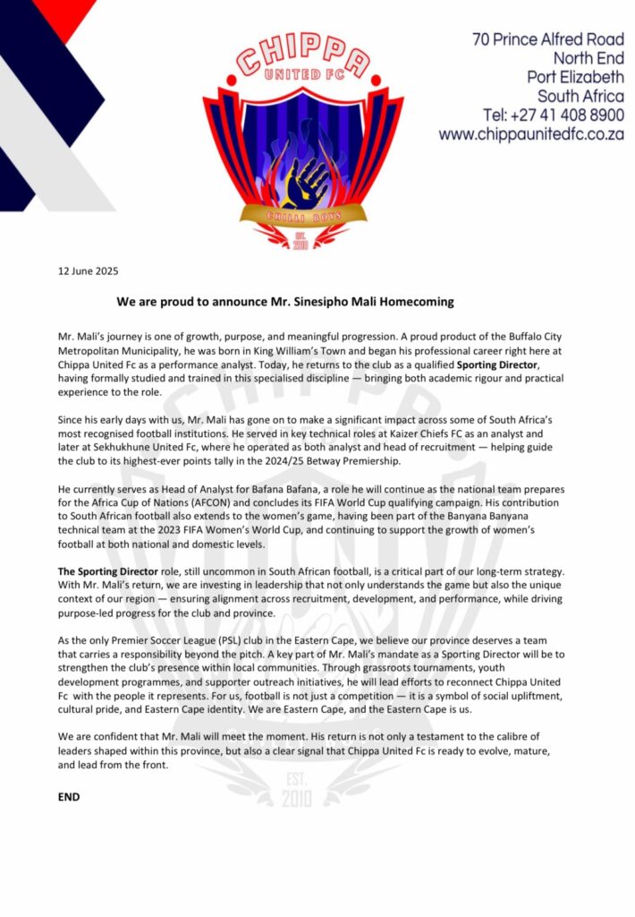 Chippa United have confirmed the appointment of Sinesipho Mali as the club’s new Sporting Director, as previously reported by iDiski Times.